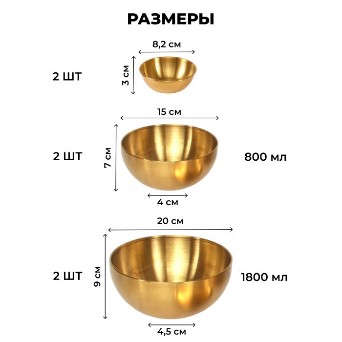 Набор Мисок из нержавеющей стали 4шт (15см-2шт+20см-2шт +соусник 8, 5 см-2 шт ) золото 265460