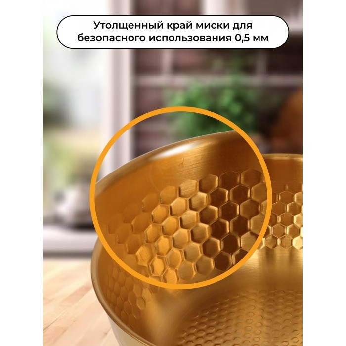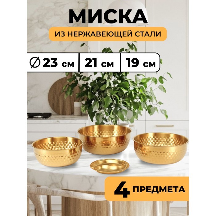 Набор Мисок из нержавеющей стали (соты) 3шт (19см-1шт+21см-1шт+23см-1шт+менажница 14см) золото 265526